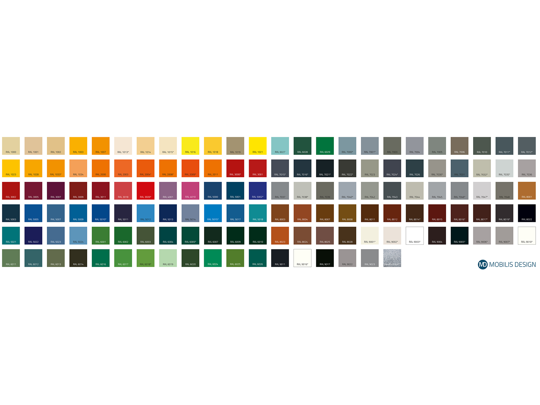 Du kan velge fritt mellom et stort utvalg av RAL-farger uten ekstra kostnad. Du kan dessuten alltid velge blant alle øvrige RAL-farger mot et tillegg i pris.